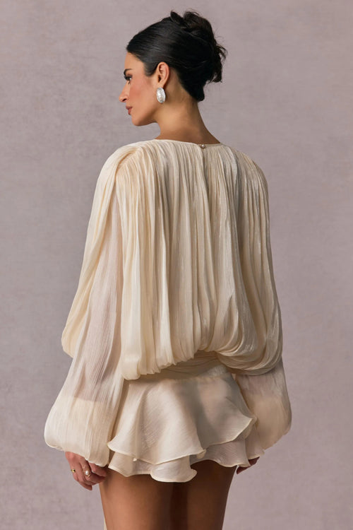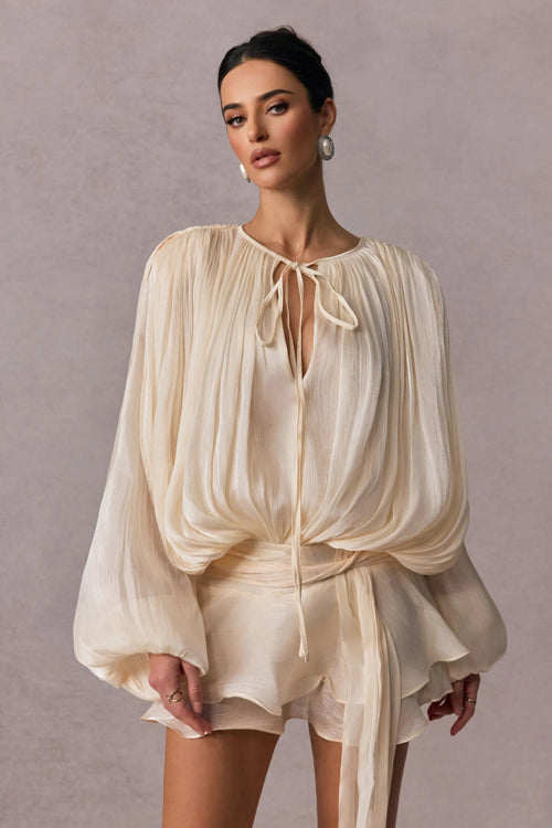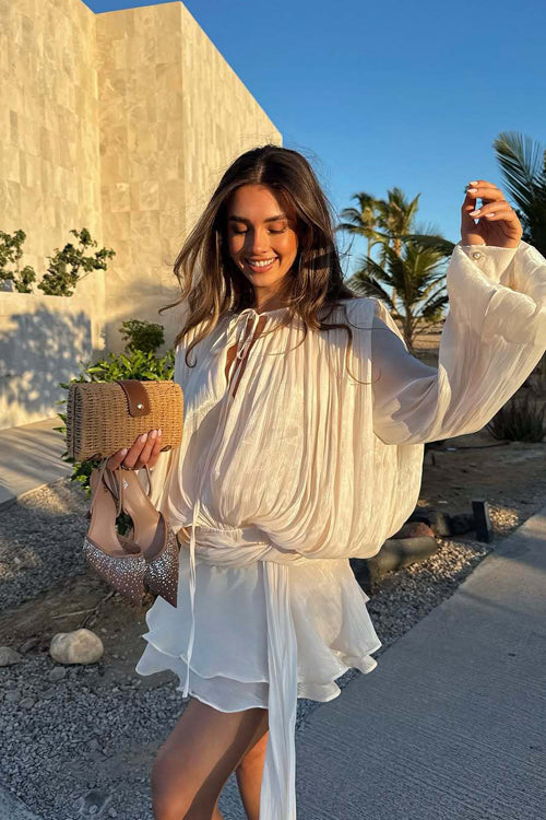 Treat yourself to something both cute and eye-catching, like the Captivate Me Layered Long Sleeve Mini Dress! Premium synthetic fibers shapes this cocktail-ready dress with elegant long sleeves with gathered cuffs, a round neckline (with front ties), a romantic ruffled hem and a soft ivory hue that flatters in any light.