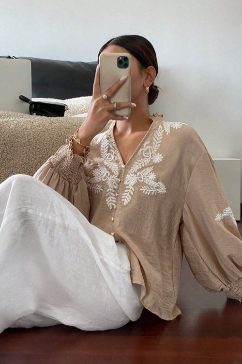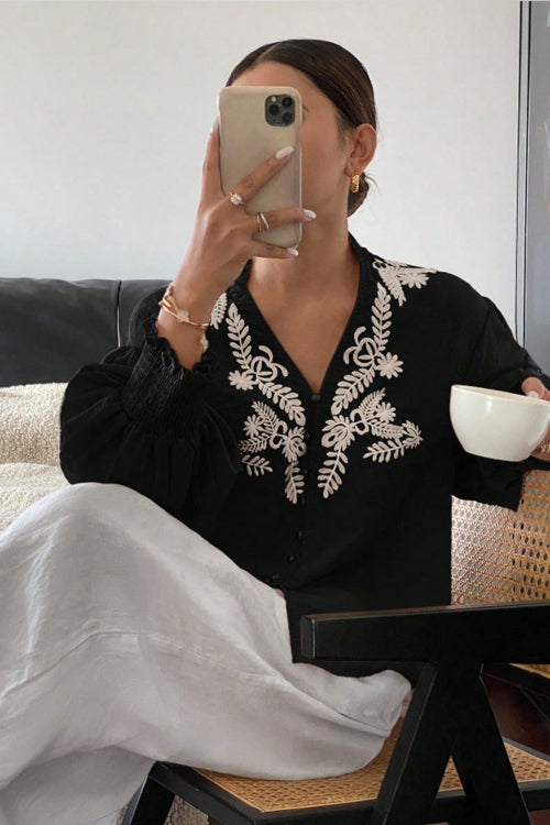 With classic style and an effortlessly sweet essence, you'll be the chicest in the streets in this Everyday Luck Floral Embroidered Cotton Top. Crafted with a floral embroidery, the blousy bodice features a V-neckline and a covered button placket, all framed by long blouson sleeves with dropped shoulders and elastic cuffs.