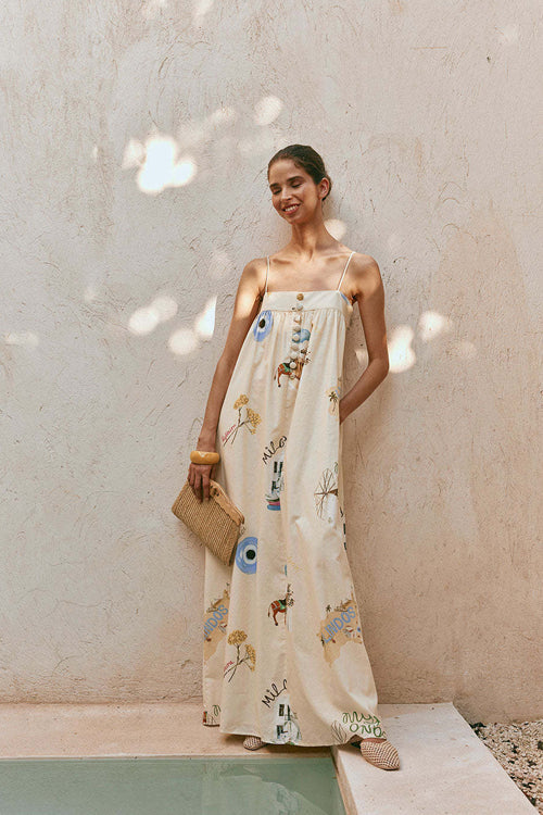 This lightweight, flax-woven sundress was made for warmer days with its shift-style silhouette and bright, fun-pattern print. A relaxed racerback design supports a square neck bodice and a maxi skirt. -