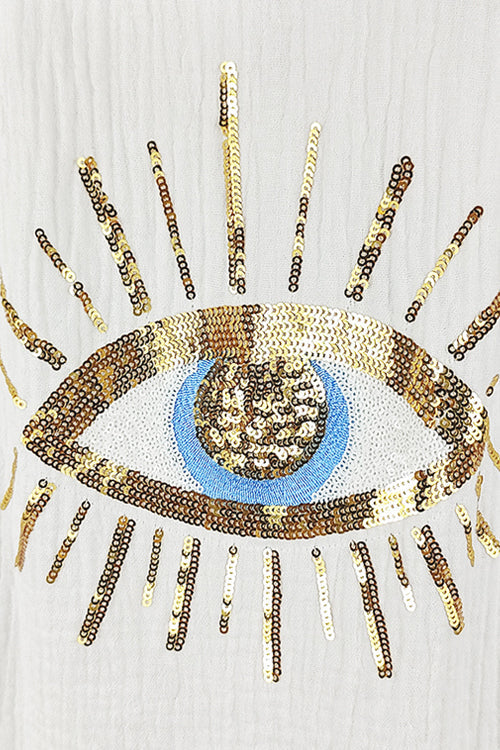 Everyone can totally tell how stylish you're looking today with the Summer Escapades Linen Sequin-Embroidered Top! Lightweight, crinkly woven cotton fabric forms a collared neckline and long sleeves with drop shoulders and button cuffs. The oversized, button-up bodice has a sequin-eye-embroidery at the back and ends at a notched rounded hem.-