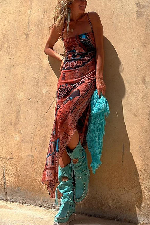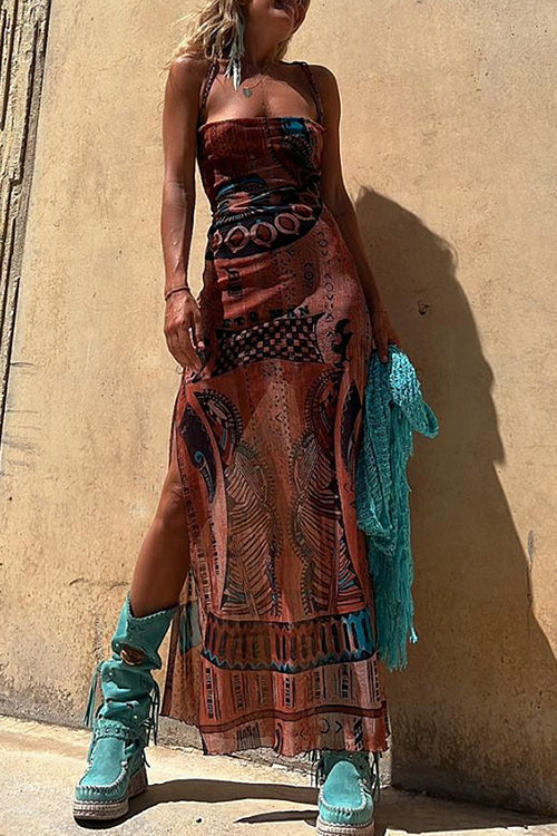 Catch everyone's eye with this Vibrant Babe Bohemian Print Drawstring Maxi Dress, crafted from airy light-weight fabric that falls from adjustable straps into a sweetheart bodice and an open back with drawstrings. The full fitted silhouette moves with your every step, thanks to the strategic thigh-high side slit at the maxi hem.